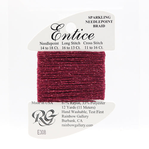 This is Entice from Rainbow Gallery in color 308 Cherry Pink. A gently sparkly thread that is perfect for adding some shine to any project. Use as-is on 18 mesh.