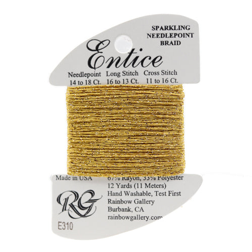 This is Entice from Rainbow Gallery in color 310 Golden Nugget. A gently sparkly thread that is perfect for adding some shine to any project. Use as-is on 18 mesh.