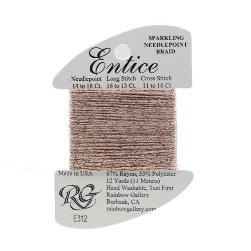 This is Entice from Rainbow Gallery in color 312 Evening Sand. A gently sparkly thread that is perfect for adding some shine to any project. Use as-is on 18 mesh.