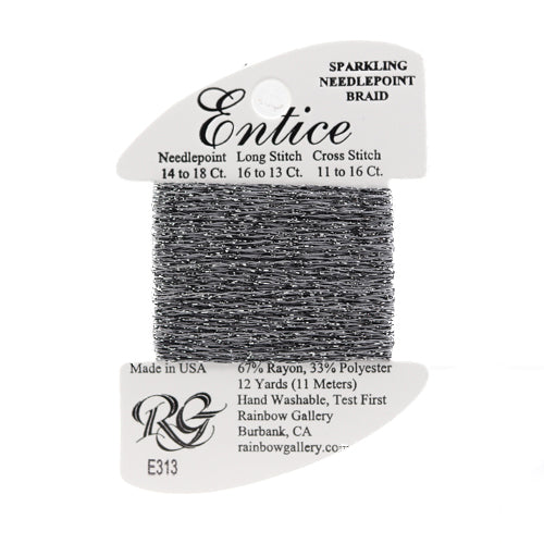 This is Entice from Rainbow Gallery in color 313 Gunmetal. A gently sparkly thread that is perfect for adding some shine to any project. Use as-is on 18 mesh.
