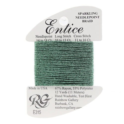 This is Entice from Rainbow Gallery in color 315 Frosty Spruce. A gently sparkly thread that is perfect for adding some shine to any project. Use as-is on 18 mesh.