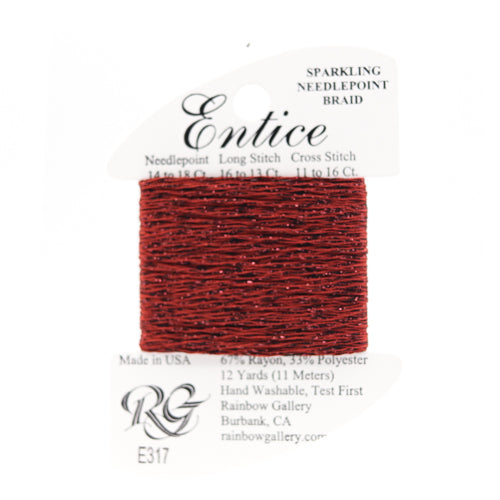 This is Entice from Rainbow Gallery in color 317 Barn Red. A gently sparkly thread that is perfect for adding some shine to any project. Use as-is on 18 mesh.