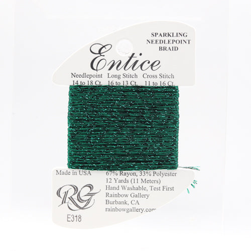 This is Entice from Rainbow Gallery in color 318 Ivy League. A gently sparkly thread that is perfect for adding some shine to any project. Use as-is on 18 mesh.