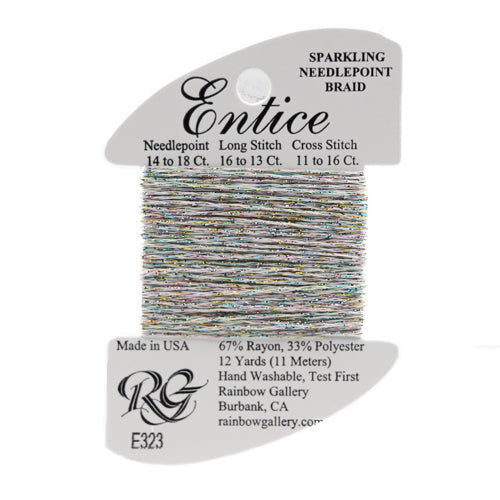 This is Entice from Rainbow Gallery in color 323 Rainbow Ice. A gently sparkly thread that is perfect for adding some shine to any project. Use as-is on 18 mesh.