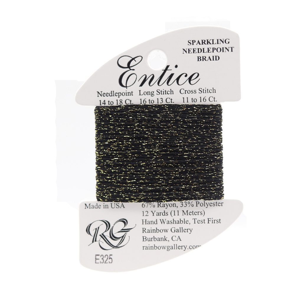 This is Entice from Rainbow Gallery in color 325 Antique Gold 2. A gently sparkly thread that is perfect for adding some shine to any project. Use as-is on 18 mesh.