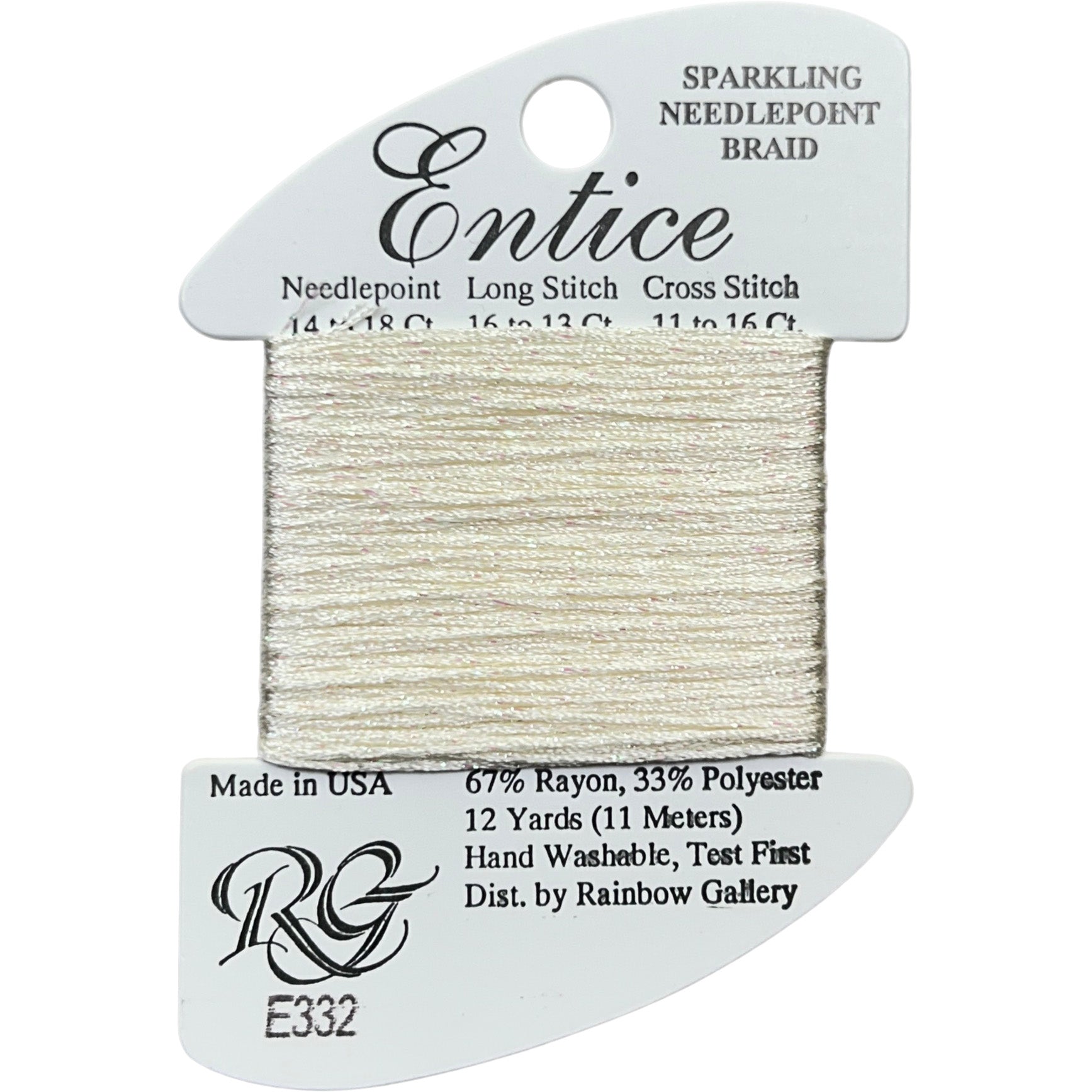This is Entice from Rainbow Gallery in color 332 Candlelit Beige. A gently sparkly thread that is perfect for adding some shine to any project. Use as-is on 18 mesh.