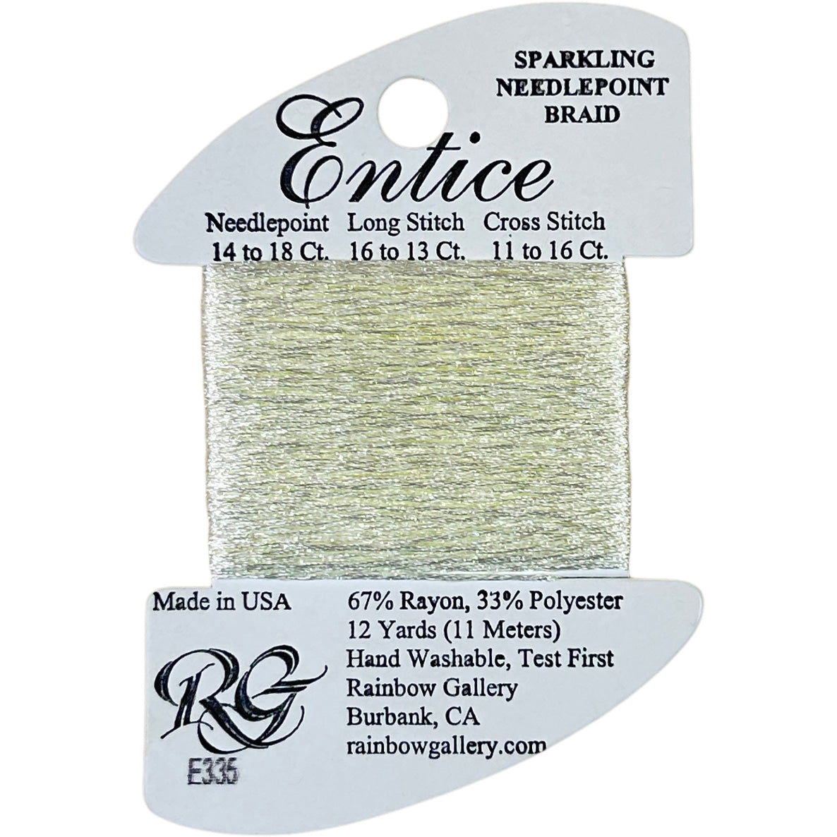 This is Entice from Rainbow Gallery in color 335 Yellow Iris. A gently sparkly thread that is perfect for adding some shine to any project. Use as-is on 18 mesh.