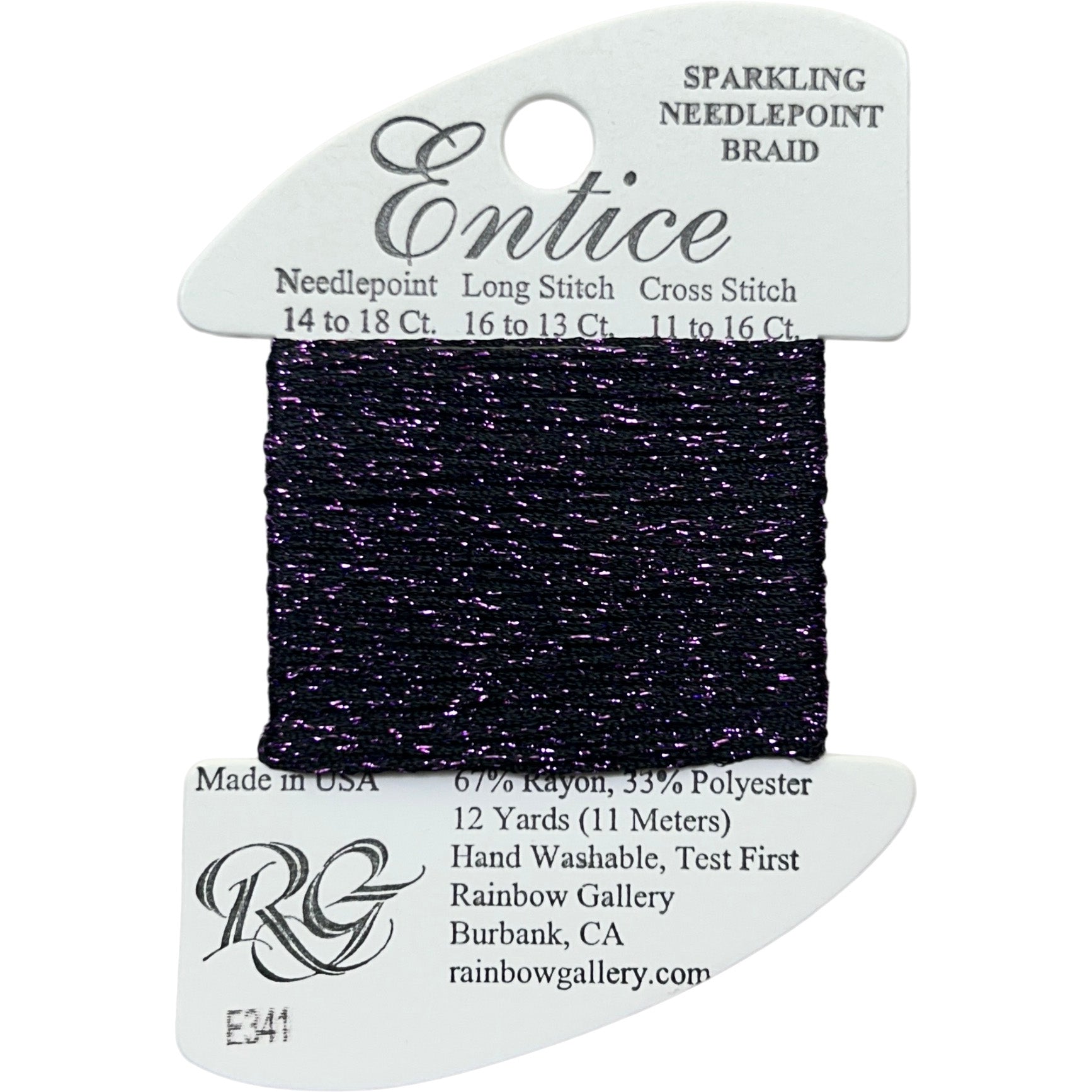 This is Entice from Rainbow Gallery in color 341 Mardi Gras. A gently sparkly thread that is perfect for adding some shine to any project. Use as-is on 18 mesh.