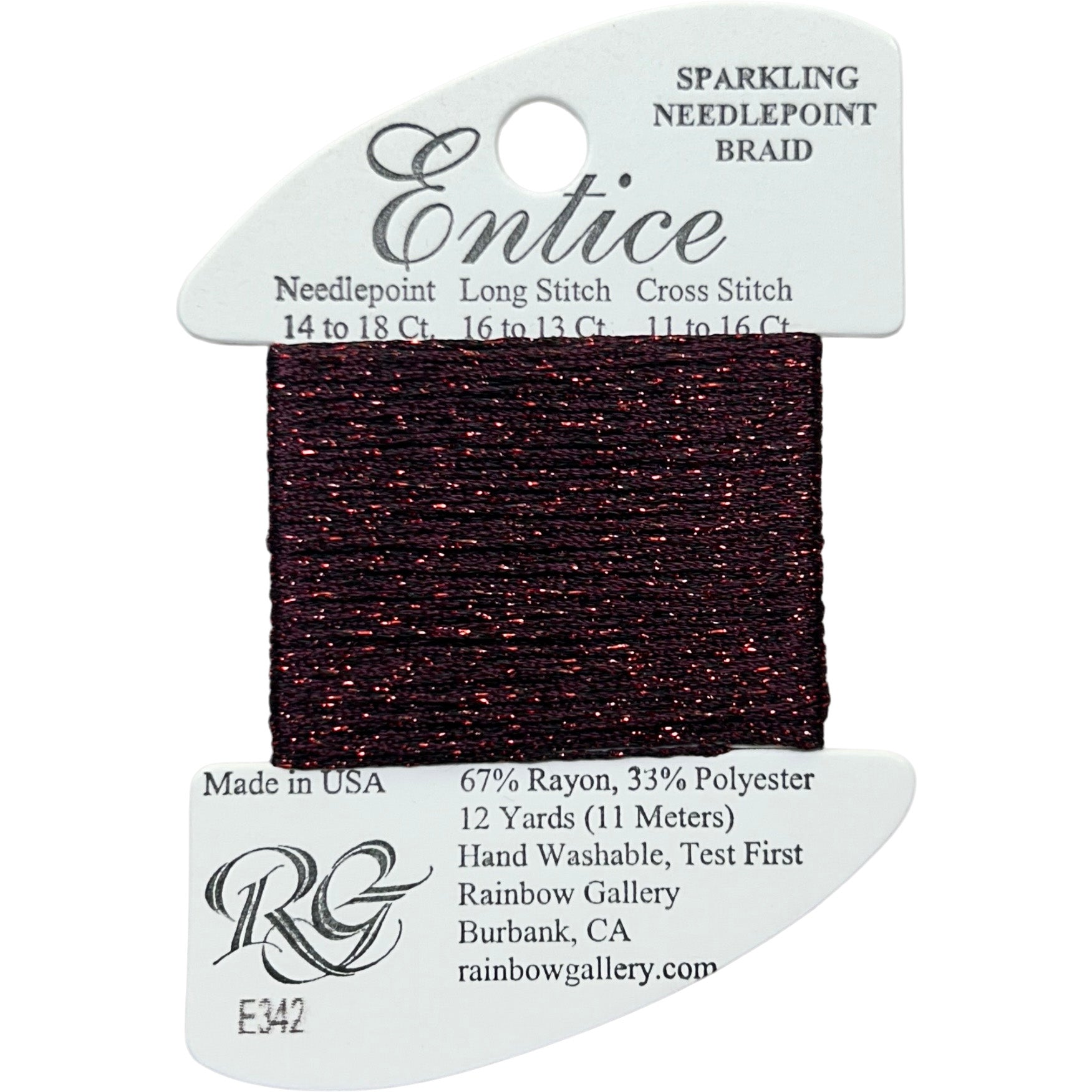 This is Entice from Rainbow Gallery in color 342 Red Wine. A gently sparkly thread that is perfect for adding some shine to any project. Use as-is on 18 mesh.