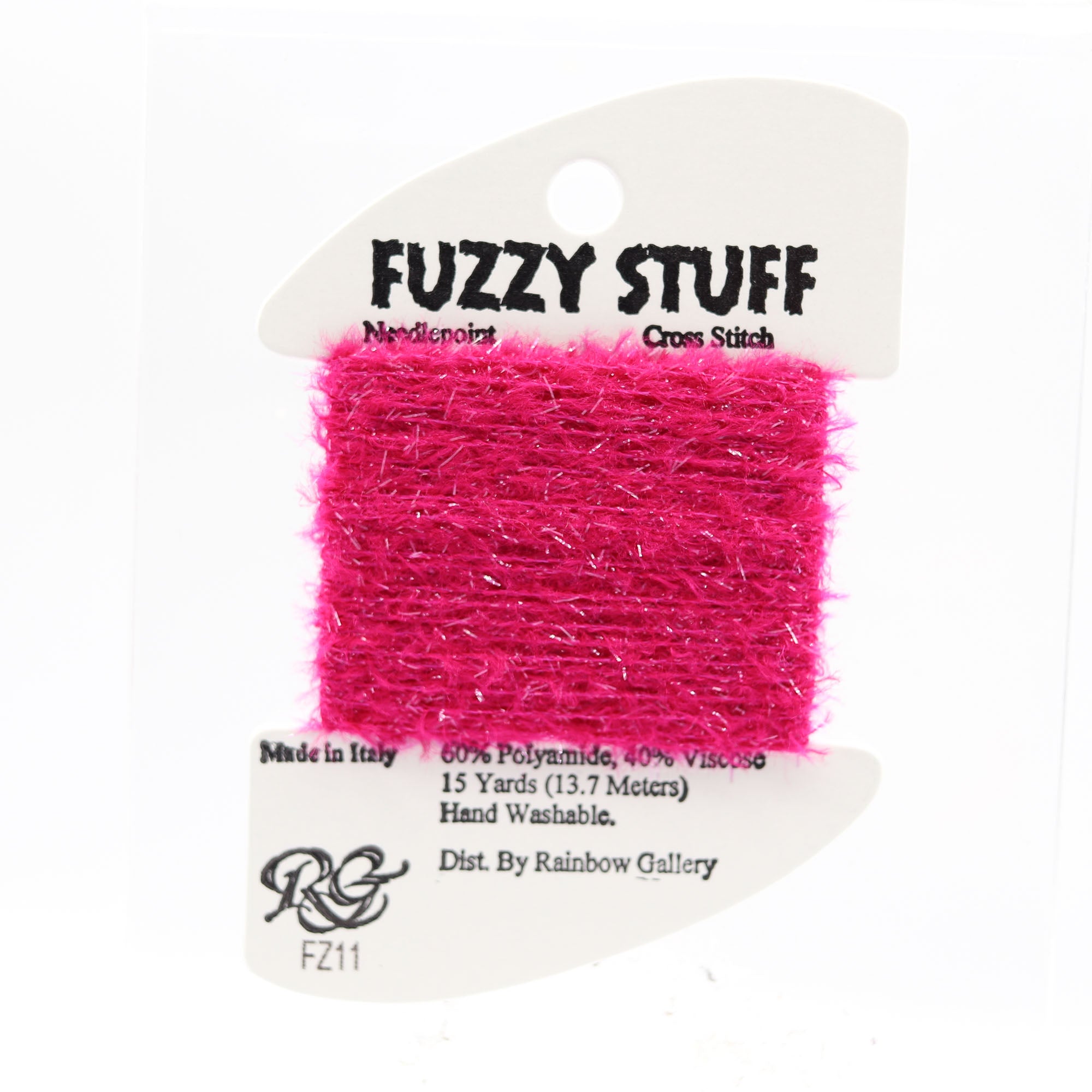 This is Fuzzy Stuff from Rainbow Gallery in color 11 Fuchsia. A fuzzy thread with gentle sparkle, perfect for beards and fur. 2 ply on 13 mesh, 1 ply on 18 mesh.
