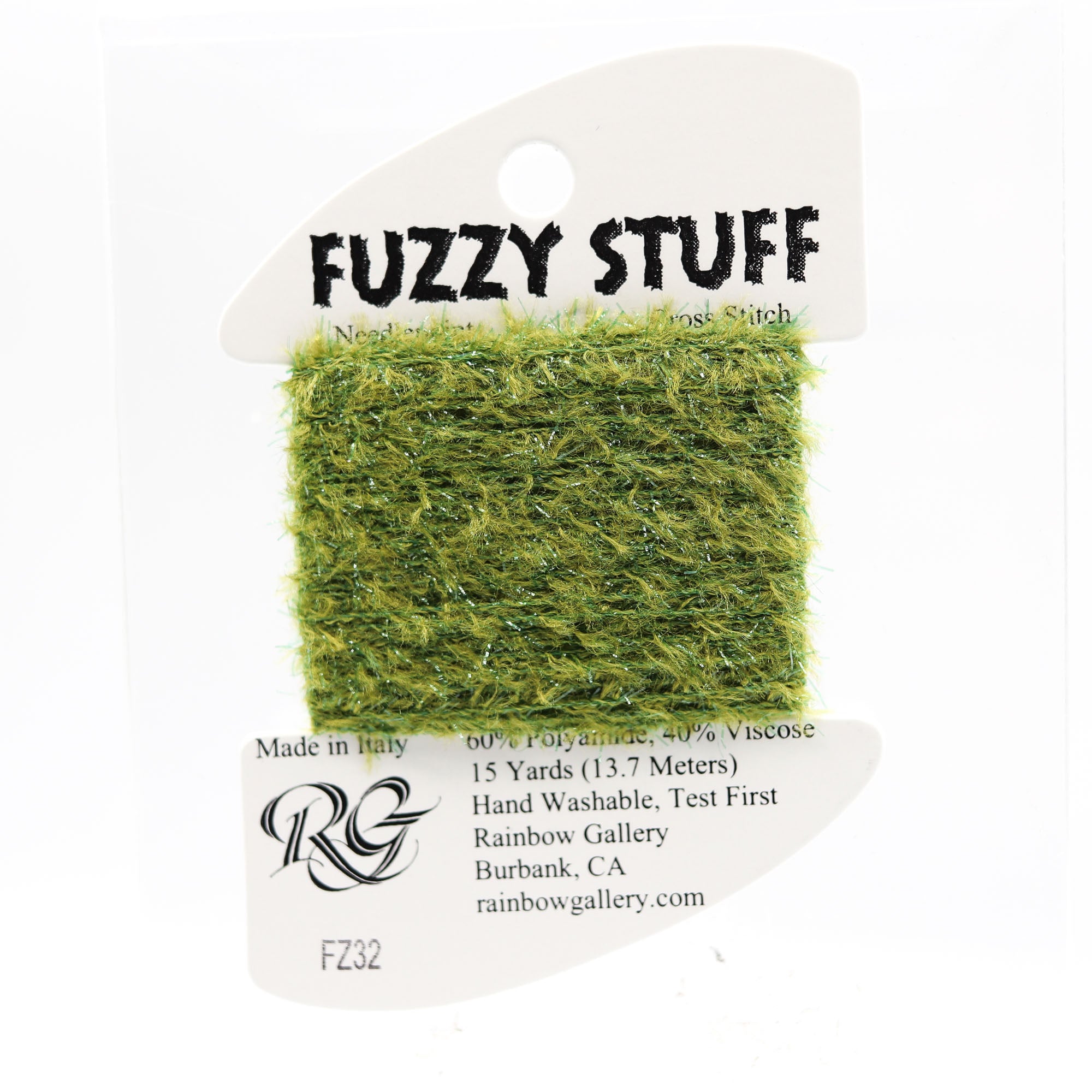 This is Fuzzy Stuff from Rainbow Gallery in color 32 Leaf Green. A fuzzy thread with gentle sparkle, perfect for beards and fur. 2 ply on 13 mesh, 1 ply on 18 mesh.