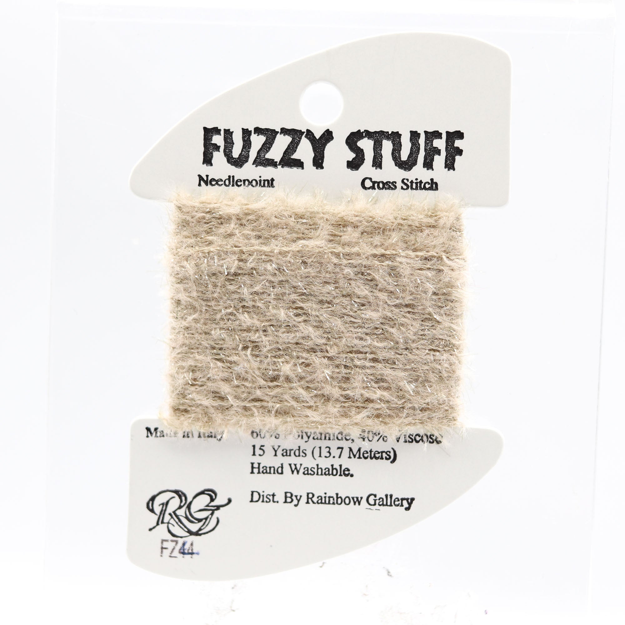 This is Fuzzy Stuff from Rainbow Gallery in color 44 Tstd Almd. A fuzzy thread with gentle sparkle, perfect for beards and fur. 2 ply on 13 mesh, 1 ply on 18 mesh.