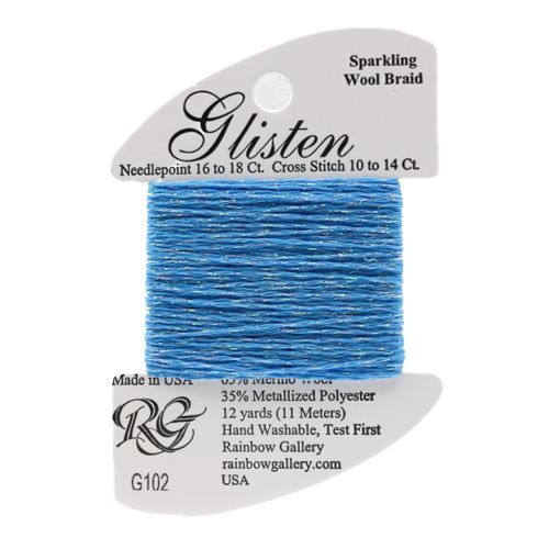 This is Glisten from Rainbow Gallery in color 102 Blue Grotto. A sparkly thread with a wool base. Great for adding just a hint of sparkle. Use as-is on 18 mesh.