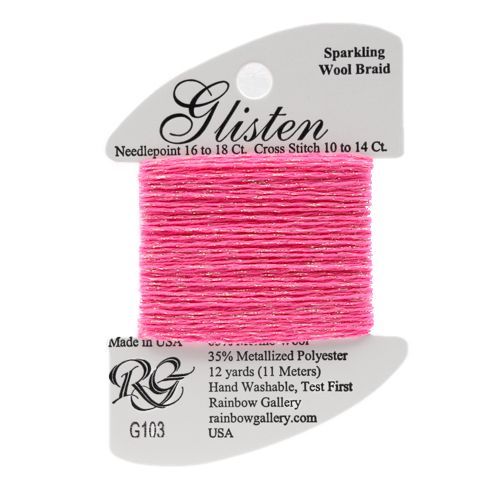 This is Glisten from Rainbow Gallery in color 103 Neon Pink. A sparkly thread with a wool base. Great for adding just a hint of sparkle. Use as-is on 18 mesh.