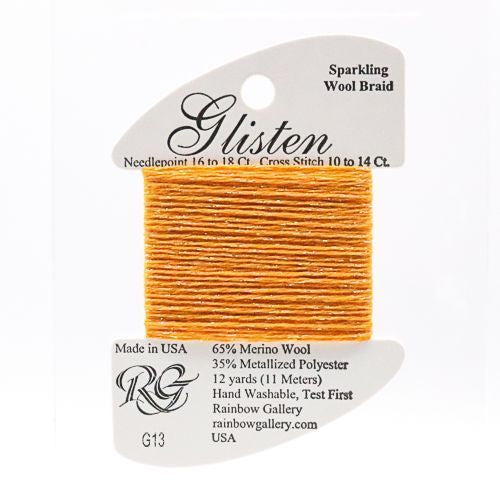 This is Glisten from Rainbow Gallery in color 013 Orange Popsicle. A sparkly thread with a wool base. Great for adding just a hint of sparkle. Use as-is on 18 mesh.