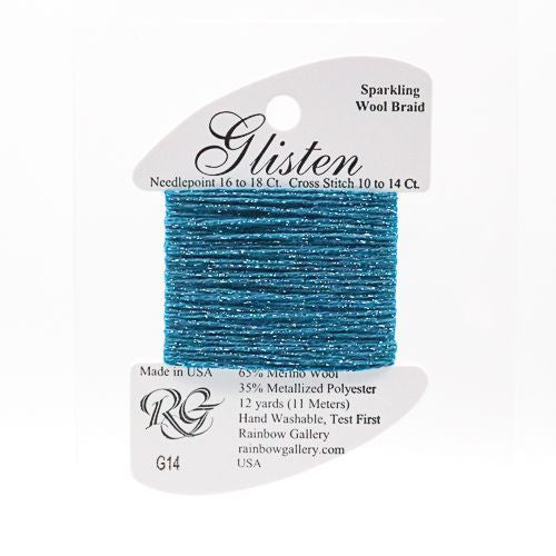 This is Glisten from Rainbow Gallery in color 014 Blue Jewel. A sparkly thread with a wool base. Great for adding just a hint of sparkle. Use as-is on 18 mesh.