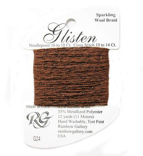 This is Glisten from Rainbow Gallery in color 024 Chocolate Pudding. A sparkly thread with a wool base. Great for adding just a hint of sparkle. Use as-is on 18 mesh.