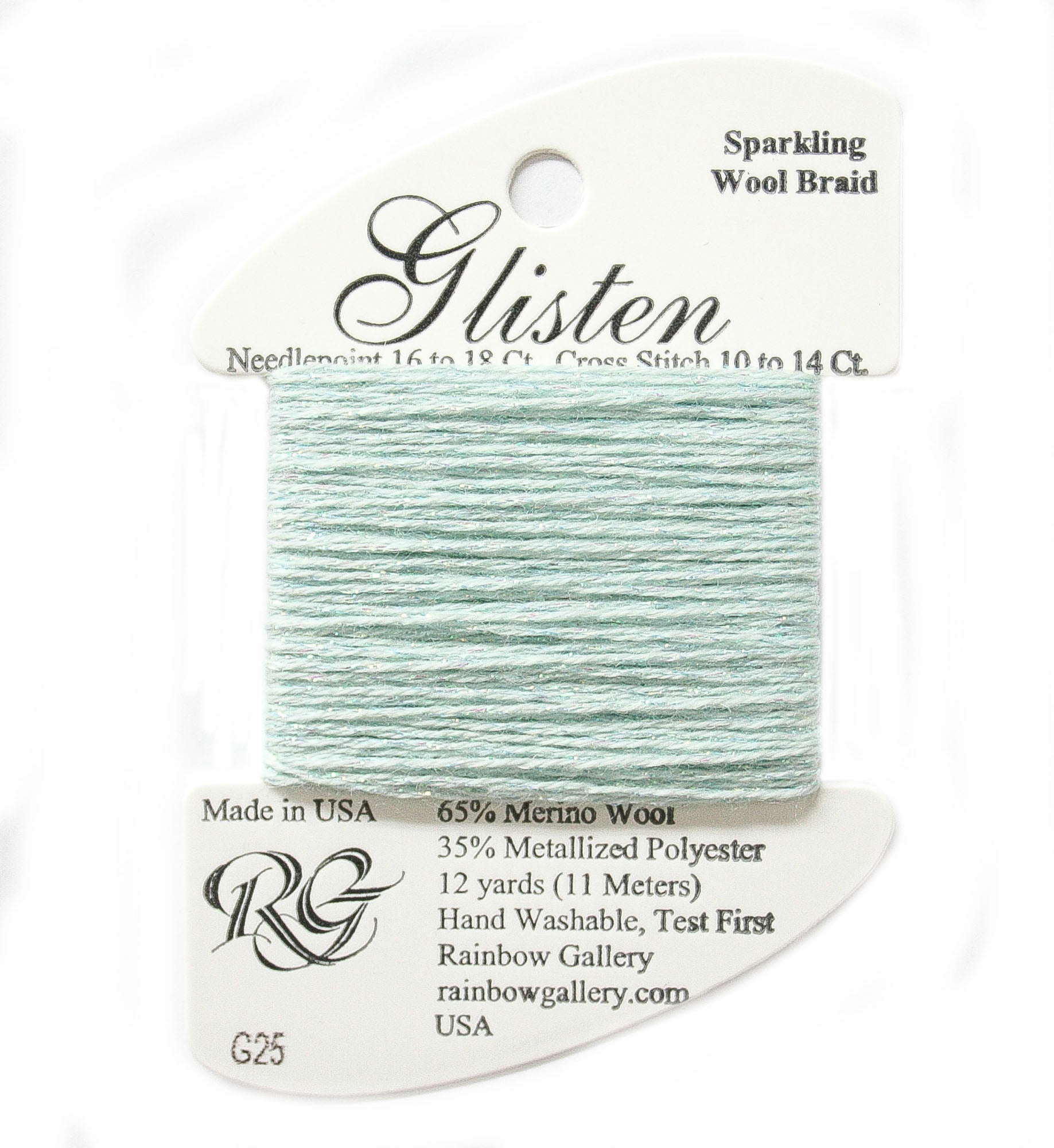 This is Glisten from Rainbow Gallery in color 025 Glacier. A sparkly thread with a wool base. Great for adding just a hint of sparkle. Use as-is on 18 mesh.