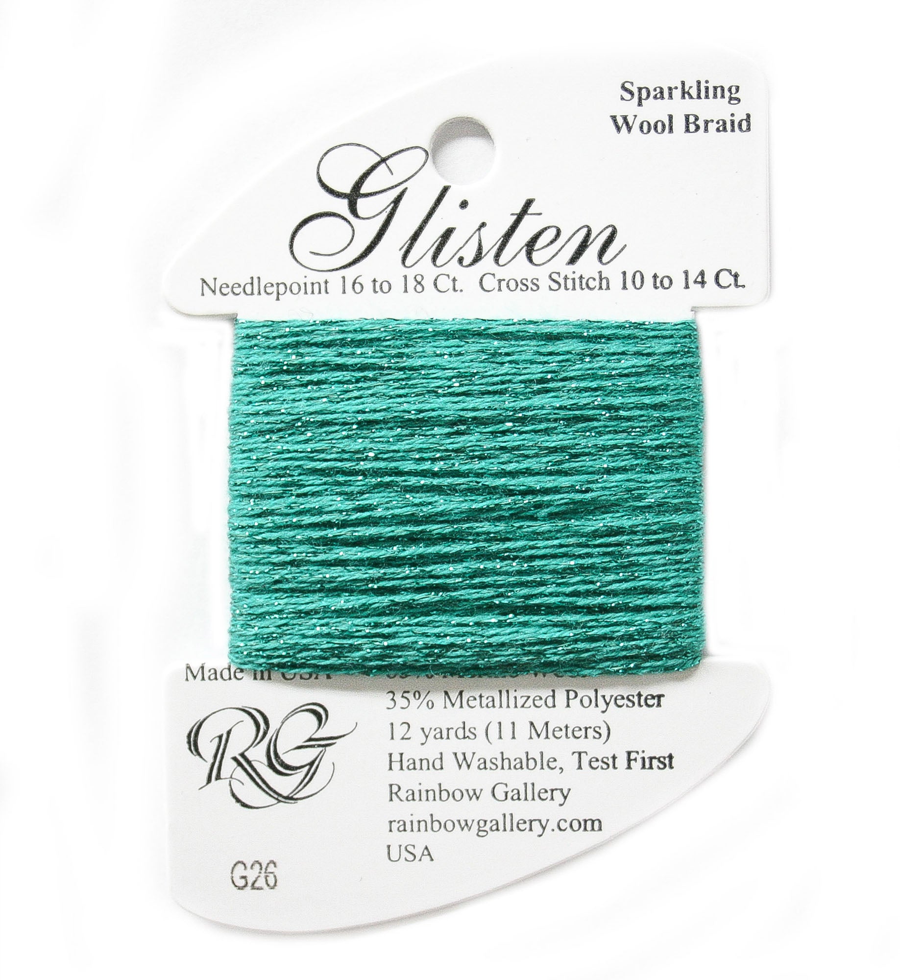 This is Glisten from Rainbow Gallery in color 026 Grecian Isle. A sparkly thread with a wool base. Great for adding just a hint of sparkle. Use as-is on 18 mesh.