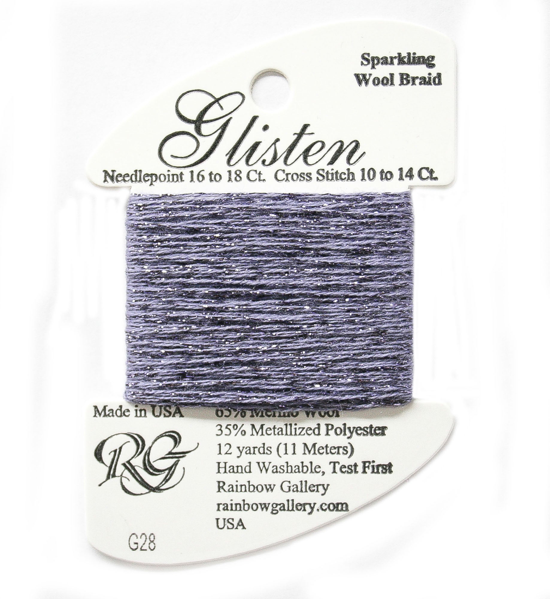 This is Glisten from Rainbow Gallery in color 028 Passion Flower. A sparkly thread with a wool base. Great for adding just a hint of sparkle. Use as-is on 18 mesh.