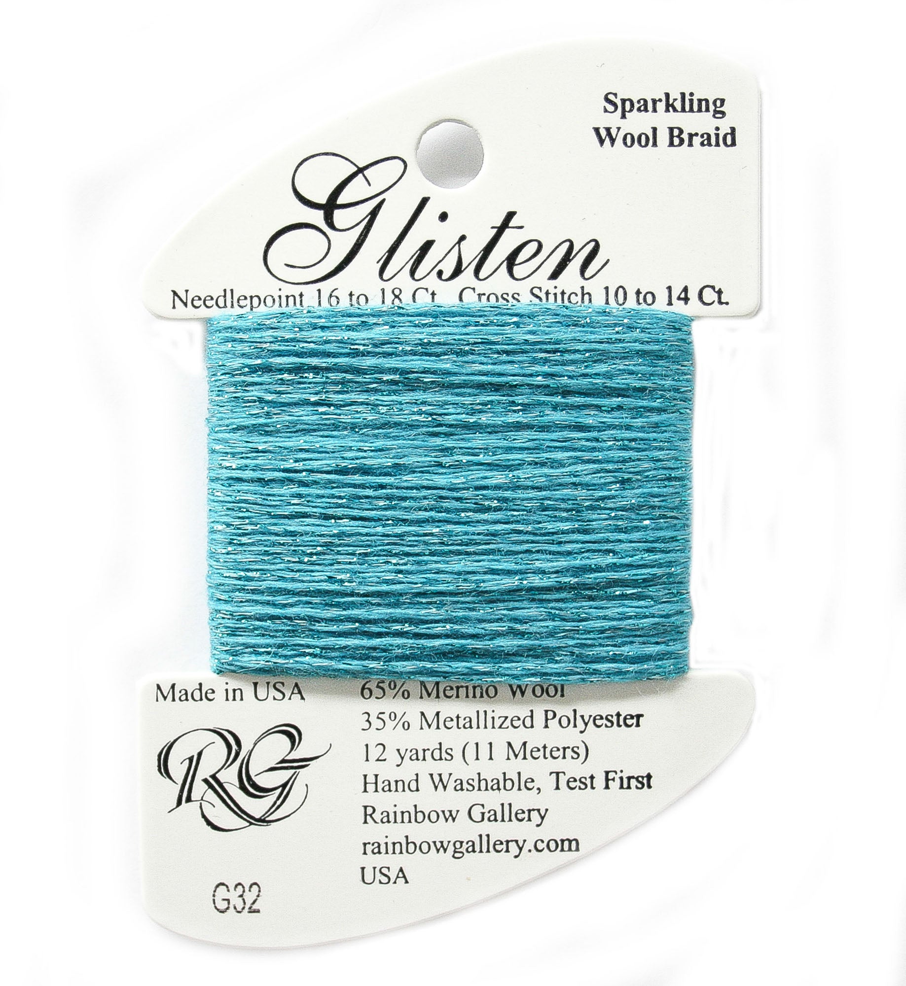 This is Glisten from Rainbow Gallery in color 032 Hawaiian Ocean. A sparkly thread with a wool base. Great for adding just a hint of sparkle. Use as-is on 18 mesh.