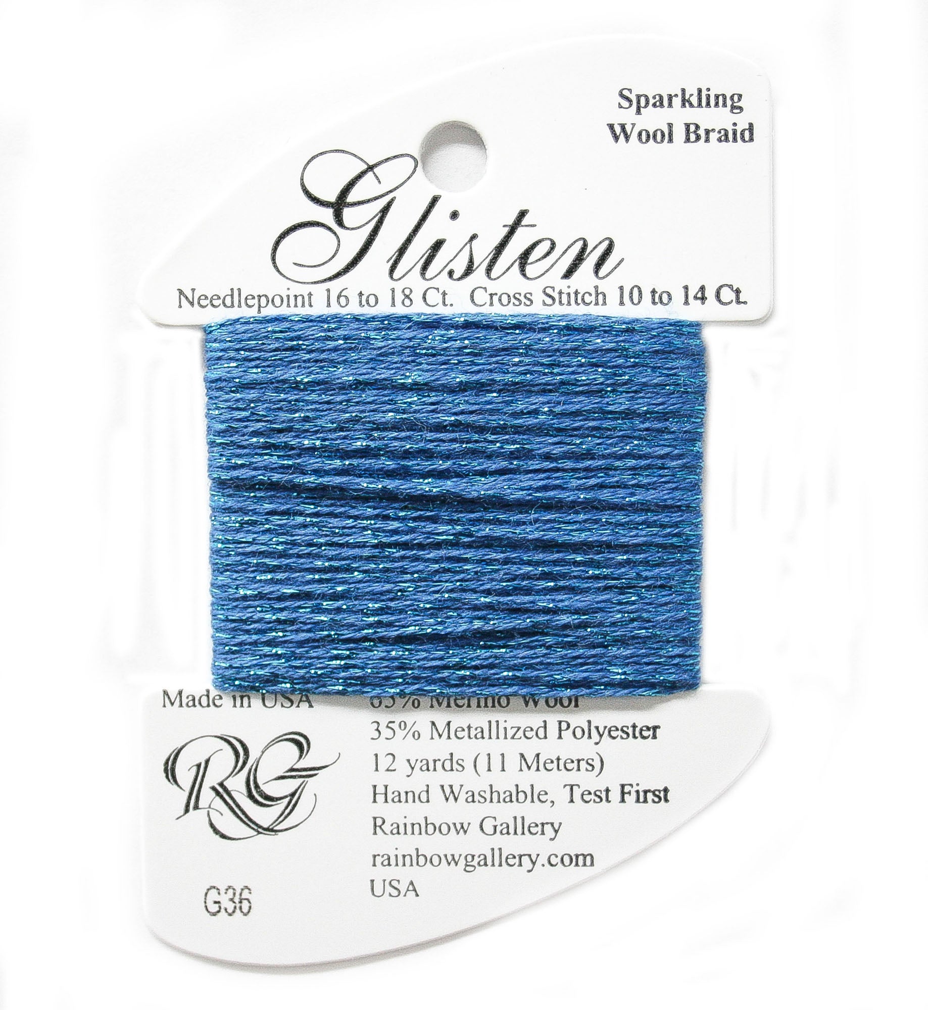 This is Glisten from Rainbow Gallery in color 036 Brilliant Blue. A sparkly thread with a wool base. Great for adding just a hint of sparkle. Use as-is on 18 mesh.