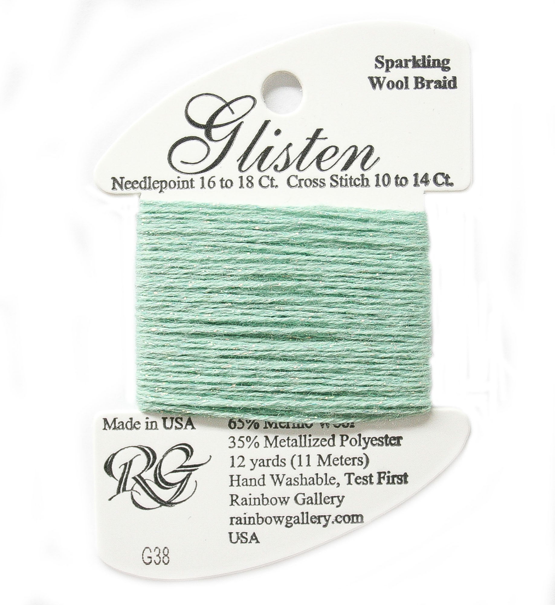 This is Glisten from Rainbow Gallery in color 038 Creme de Menthe. A sparkly thread with a wool base. Great for adding just a hint of sparkle. Use as-is on 18 mesh.