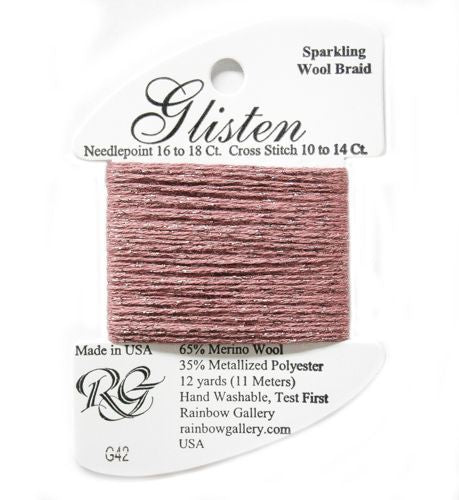 This is Glisten from Rainbow Gallery in color 042 Heather Rose. A sparkly thread with a wool base. Great for adding just a hint of sparkle. Use as-is on 18 mesh.