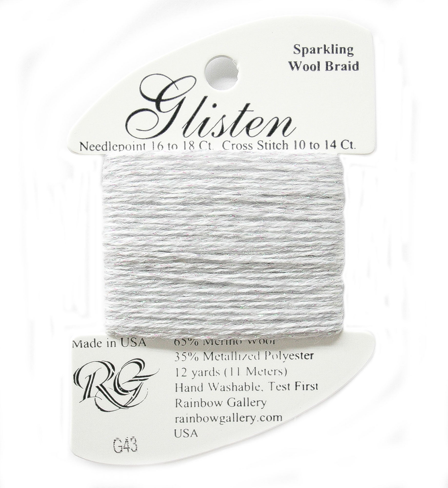 This is Glisten from Rainbow Gallery in color 043 White Sand. A sparkly thread with a wool base. Great for adding just a hint of sparkle. Use as-is on 18 mesh.