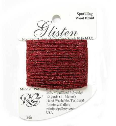 This is Glisten from Rainbow Gallery in color 046 Crimson. A sparkly thread with a wool base. Great for adding just a hint of sparkle. Use as-is on 18 mesh.