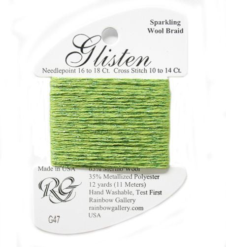 This is Glisten from Rainbow Gallery in color 047 Chartreuse. A sparkly thread with a wool base. Great for adding just a hint of sparkle. Use as-is on 18 mesh.