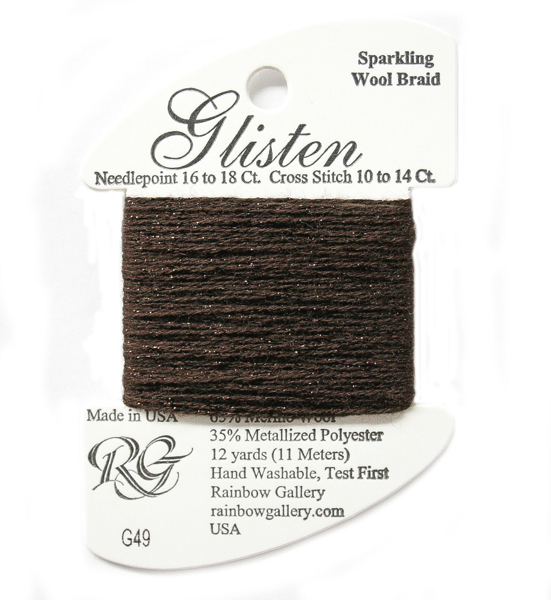 This is Glisten from Rainbow Gallery in color 049 Cappuccino. A sparkly thread with a wool base. Great for adding just a hint of sparkle. Use as-is on 18 mesh.