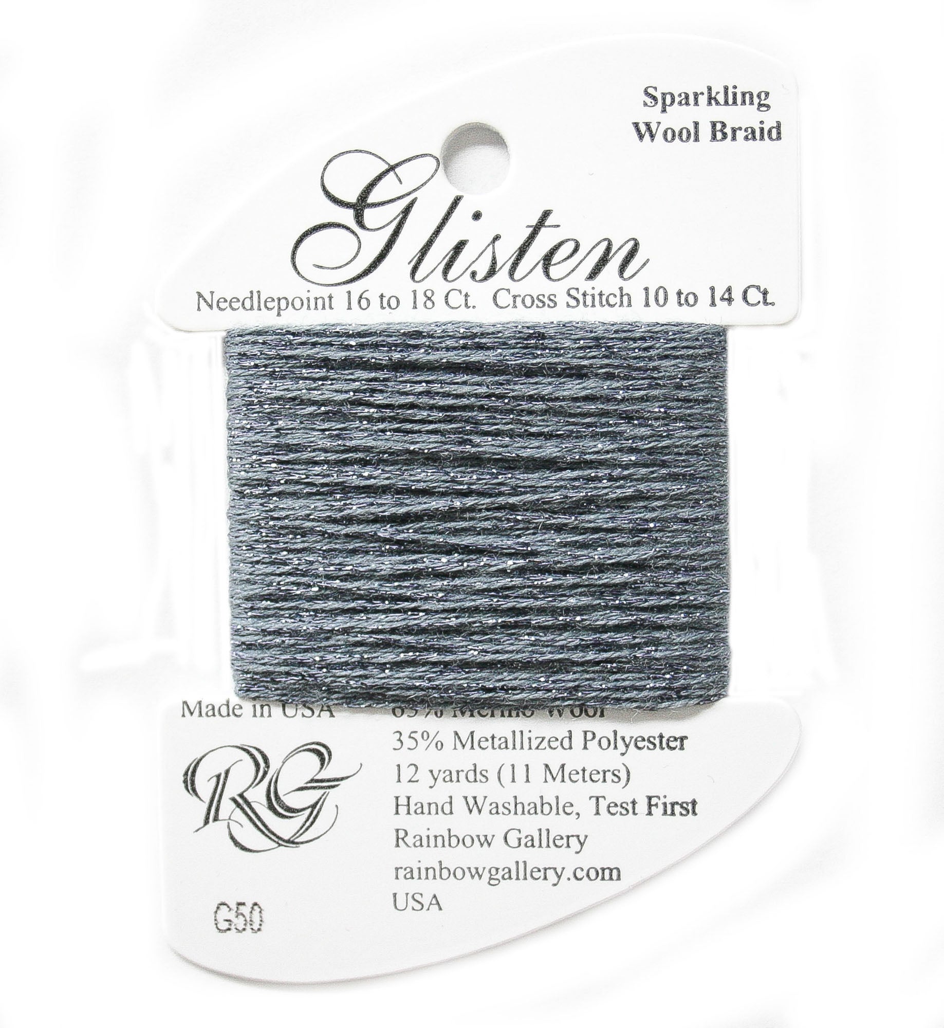 This is Glisten from Rainbow Gallery in color 050 Stonewash. A sparkly thread with a wool base. Great for adding just a hint of sparkle. Use as-is on 18 mesh.