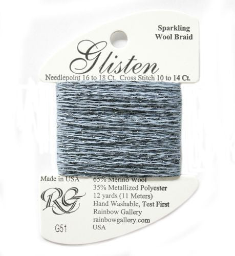 This is Glisten from Rainbow Gallery in color 051 Tempest. A sparkly thread with a wool base. Great for adding just a hint of sparkle. Use as-is on 18 mesh.