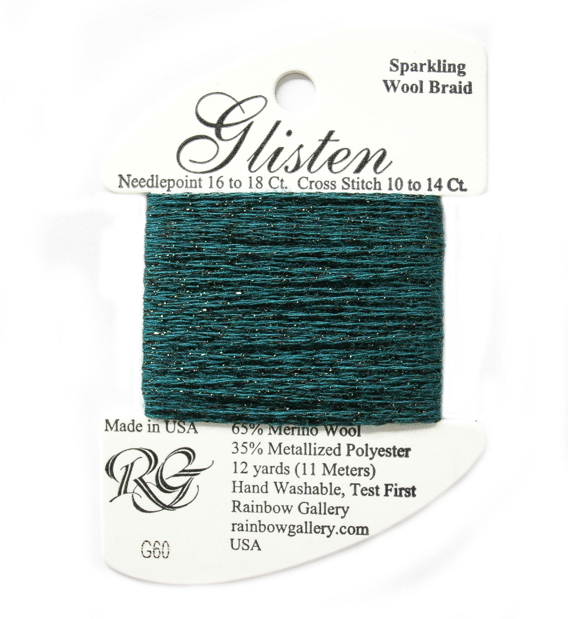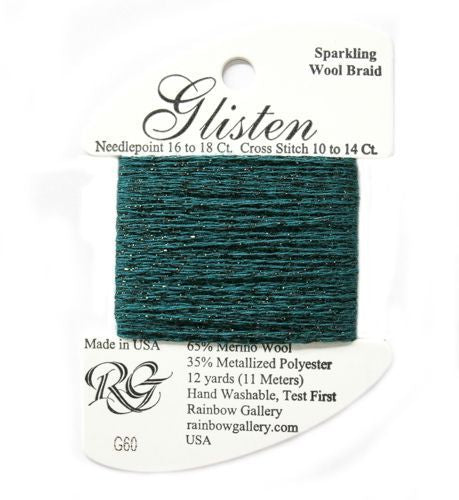 This is Glisten from Rainbow Gallery in color 060 Atlantic Deep. A sparkly thread with a wool base. Great for adding just a hint of sparkle. Use as-is on 18 mesh.
