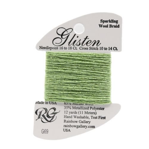 This is Glisten from Rainbow Gallery in color 069 Pistachio. A sparkly thread with a wool base. Great for adding just a hint of sparkle. Use as-is on 18 mesh.