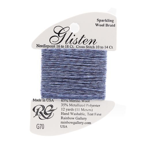 This is Glisten from Rainbow Gallery in color 070 Heather. A sparkly thread with a wool base. Great for adding just a hint of sparkle. Use as-is on 18 mesh.