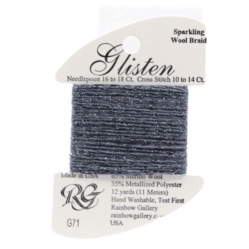 This is Glisten from Rainbow Gallery in color 071 Night Shadow Blue. A sparkly thread with a wool base. Great for adding just a hint of sparkle. Use as-is on 18 mesh.