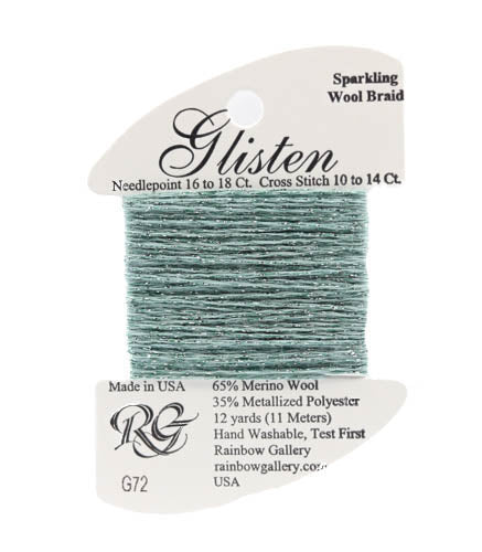 This is Glisten from Rainbow Gallery in color 072 Blue Surf. A sparkly thread with a wool base. Great for adding just a hint of sparkle. Use as-is on 18 mesh.