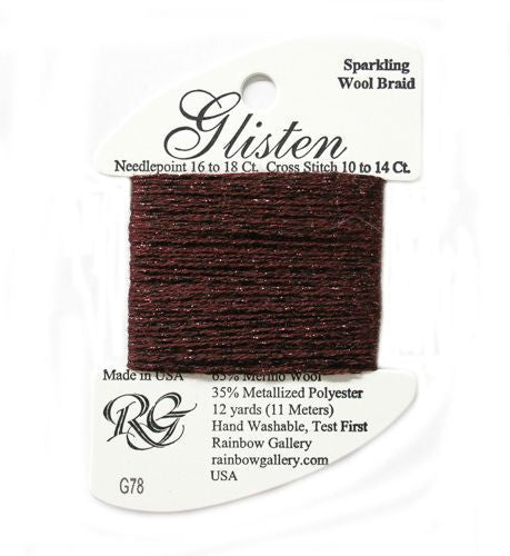 This is Glisten from Rainbow Gallery in color 078 Deep Merlot. A sparkly thread with a wool base. Great for adding just a hint of sparkle. Use as-is on 18 mesh.