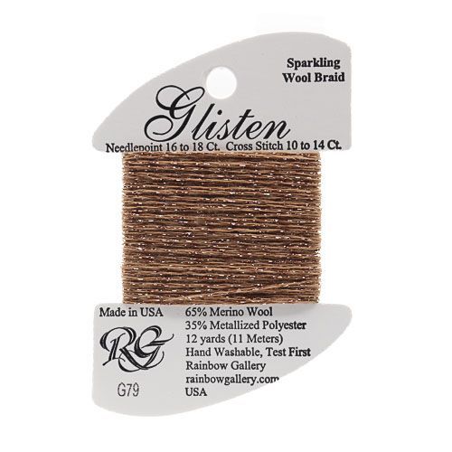 This is Glisten from Rainbow Gallery in color 079 Brown Sugar. A sparkly thread with a wool base. Great for adding just a hint of sparkle. Use as-is on 18 mesh.