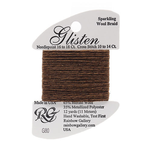 This is Glisten from Rainbow Gallery in color 080 Cocoa. A sparkly thread with a wool base. Great for adding just a hint of sparkle. Use as-is on 18 mesh.