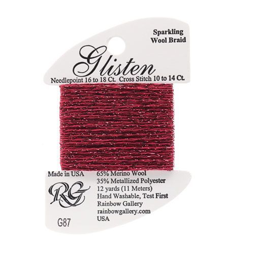 This is Glisten from Rainbow Gallery in color 087 Hearts Desire. A sparkly thread with a wool base. Great for adding just a hint of sparkle. Use as-is on 18 mesh.