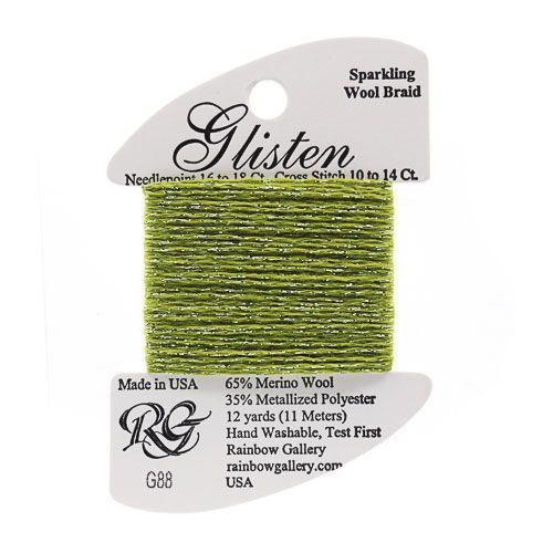 This is Glisten from Rainbow Gallery in color 088 Guacamole. A sparkly thread with a wool base. Great for adding just a hint of sparkle. Use as-is on 18 mesh.