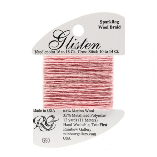 This is Glisten from Rainbow Gallery in color 090 Candy Pink. A sparkly thread with a wool base. Great for adding just a hint of sparkle. Use as-is on 18 mesh.