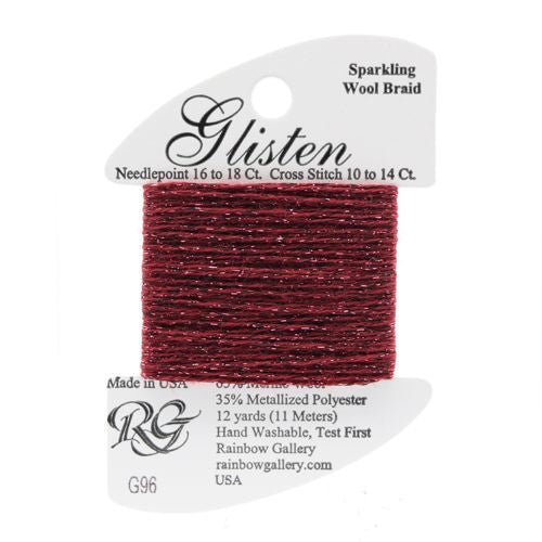This is Glisten from Rainbow Gallery in color 096 Madeira Red. A sparkly thread with a wool base. Great for adding just a hint of sparkle. Use as-is on 18 mesh.