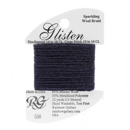 This is Glisten from Rainbow Gallery in color 098 Black Iris. A sparkly thread with a wool base. Great for adding just a hint of sparkle. Use as-is on 18 mesh.