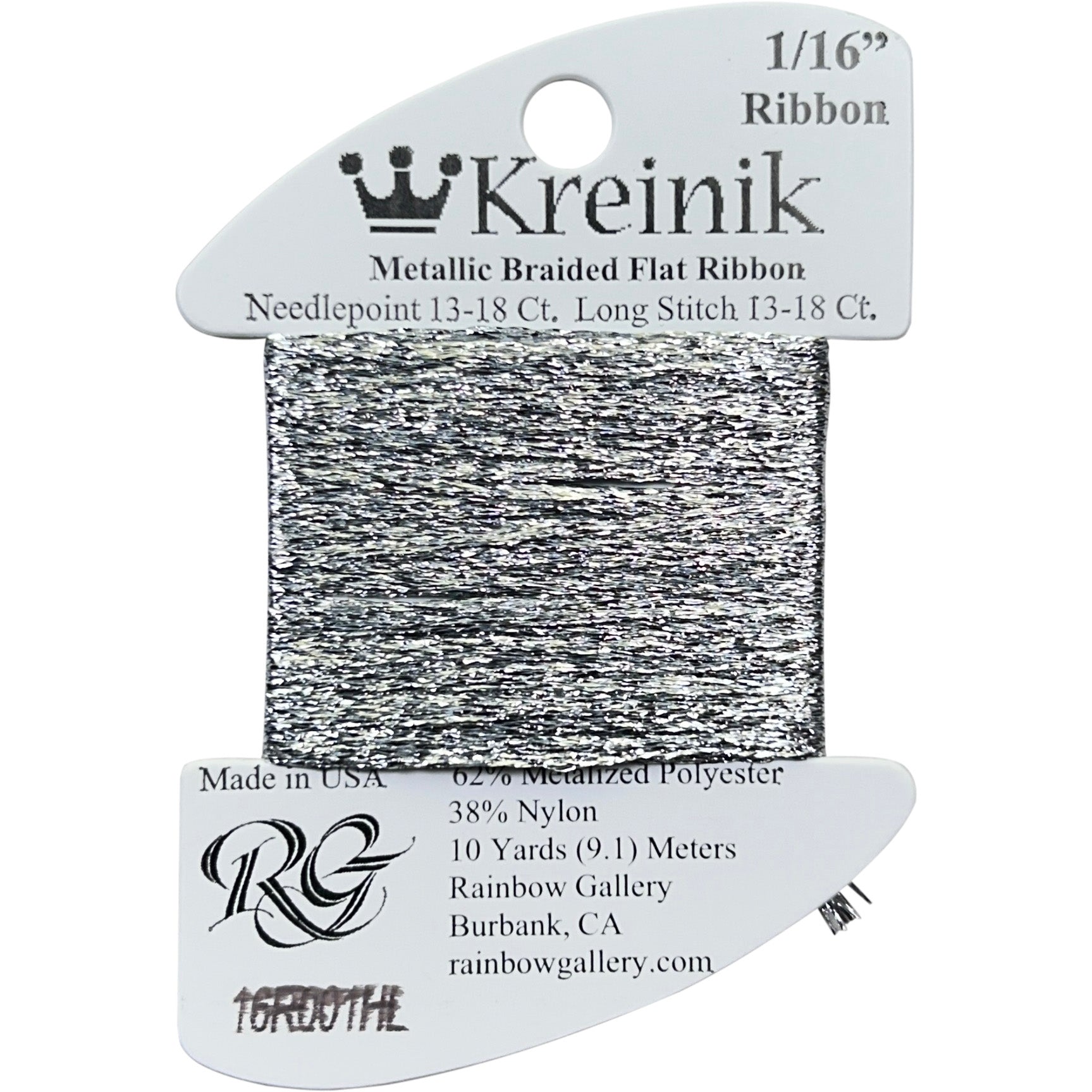 A narrow, 1/16" flat braided ribbon, wound on a card, that is soft and versatile. Curves beautifully for stitches in needlework and embroidery. Many needlepointers prefer it for its great coverage on 18-count canvas. Can also be used in cross stitch on larger counts such as 12- or 11-count Aida, or over two on 22- and 24-count linens. Lovely in ribbon embroidery stitches, in quilts, and as embroidery on clothing/costumes.