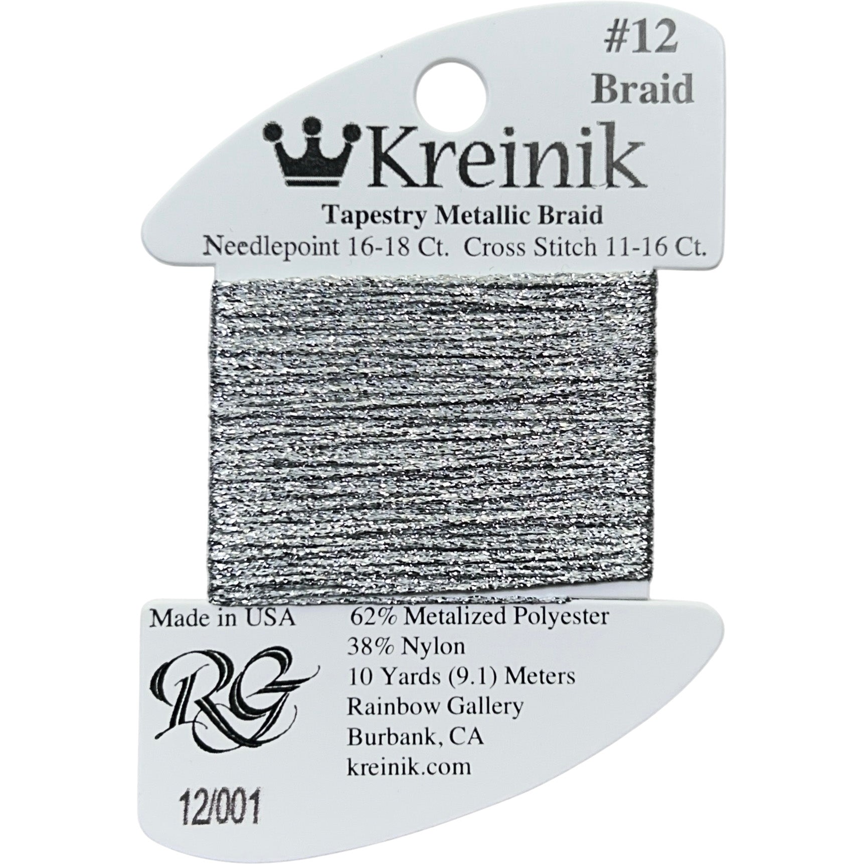 This is Kreinik Braid #12 from Rainbow Gallery in color 0001 Silver. Metallic sparkle. 1 ply on 18 mesh. About equivalent in size to #5 Perle Cotton.