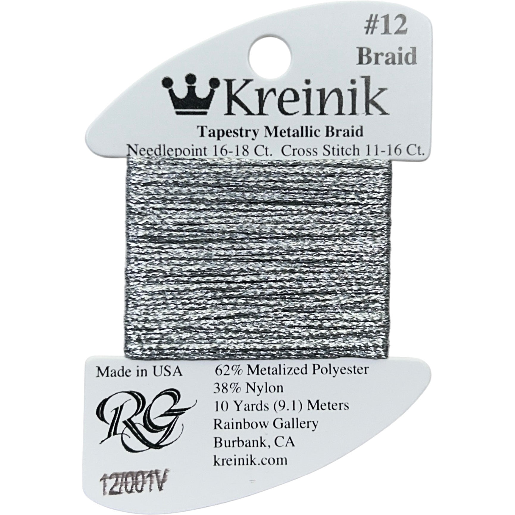 This is Kreinik Braid #12 from Rainbow Gallery in color 0001V Vintage Silver. Metallic sparkle. 1 ply on 18 mesh. About equivalent in size to #5 Perle Cotton.